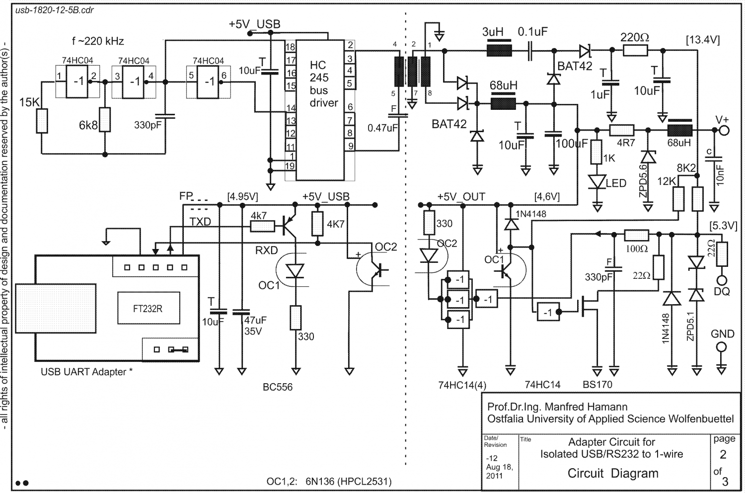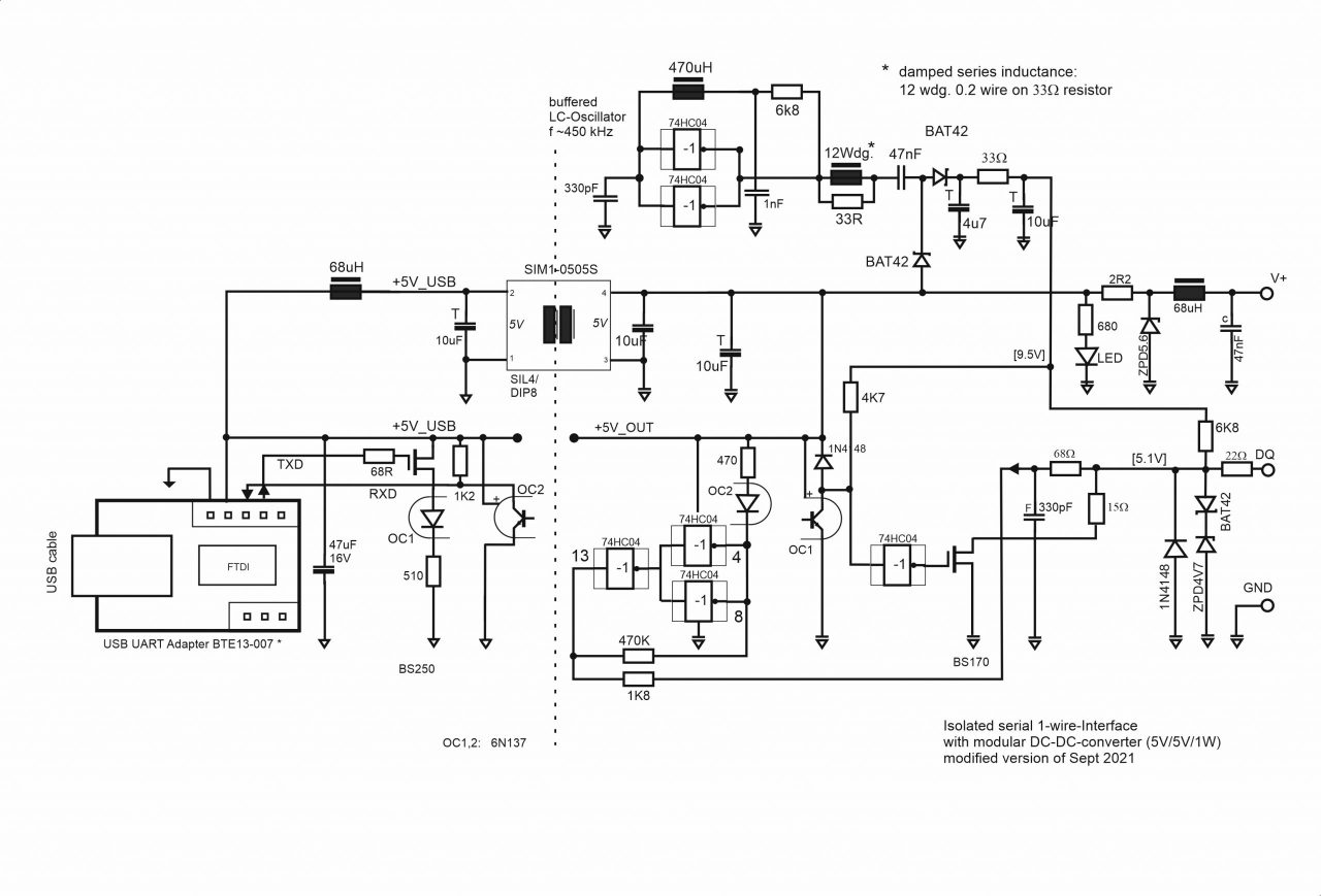 In der Schaltung werden nach dem FTDI-232 die gewandelten RX- und TX-Signale über Optokoppler weitergegeben. Die notwendige Leistung für die isolierte Seite wird mit einem 5V-5V-Netzteil übertragen. Weil die Logikpegel des 1-Wire Busses die meiste Zeit auf „high“ stehen, müssen die internen Ansteuerpegel so gewählt werden, dass bei den Optokopplern „high“ entsprechend „ohne Strom“ ist.