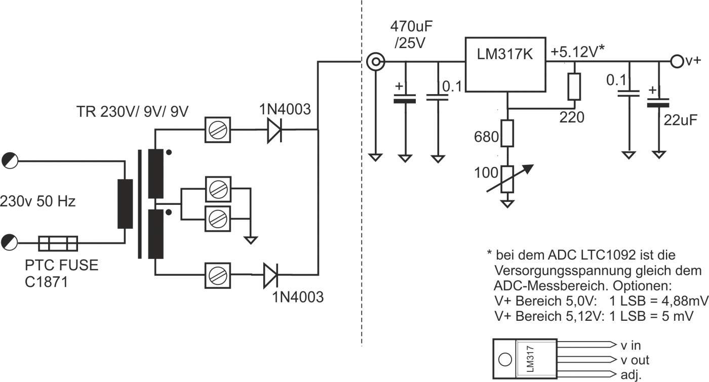 Bei dem LTC1092 ist die Versorgung gleichzeitig Referenzspannung. Daher wird mit einem einstellbaren Spannungsregel LM317 die Betriebsspannung auf 5,12V eingestellt, so dass jede Bitstufe des 10-Bit A/D-Wandlers dann 5 mV entspricht. Als Versorgungsspannung kann auch ein einfaches 12V-Steckernetzteil verwendet werden.