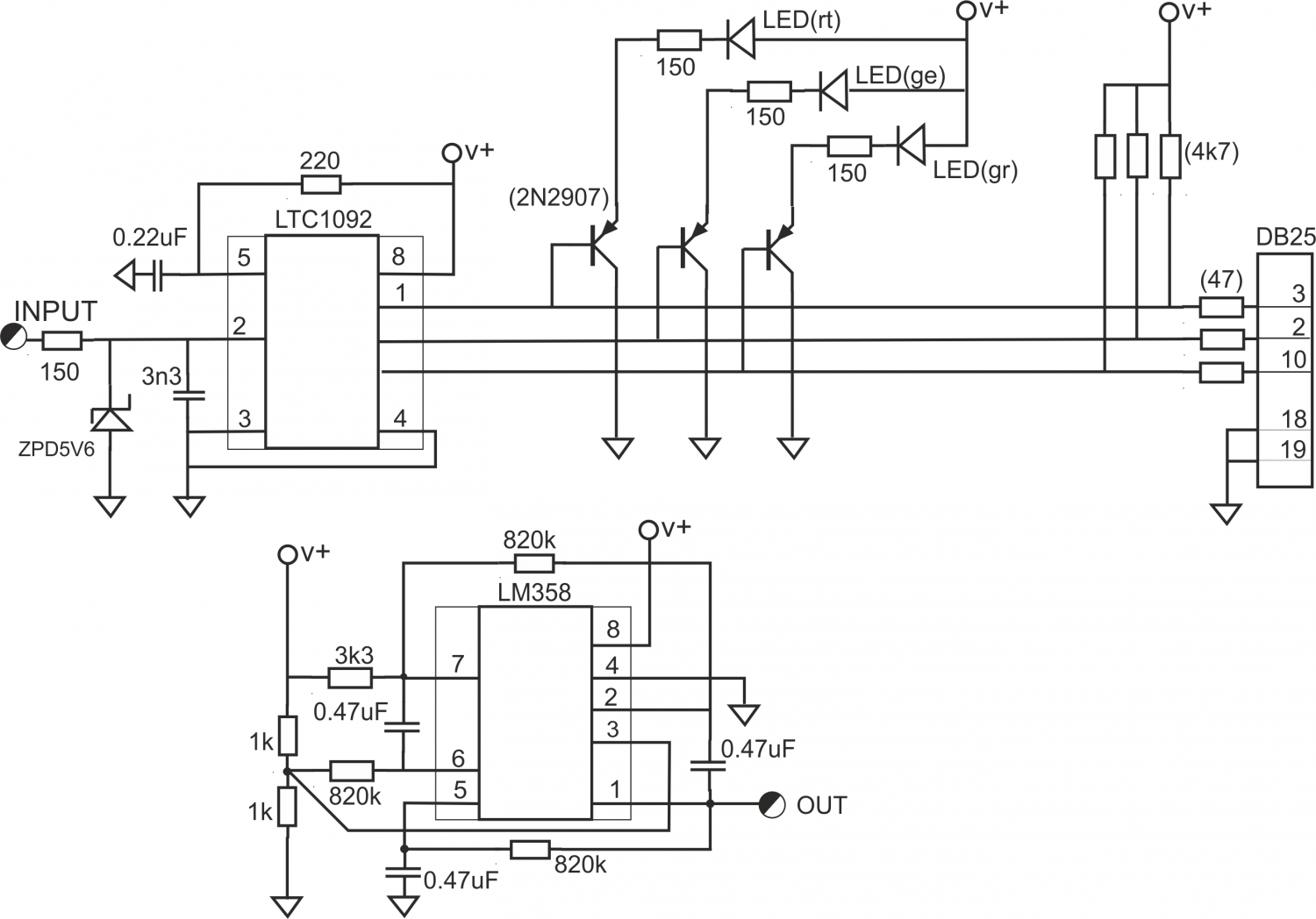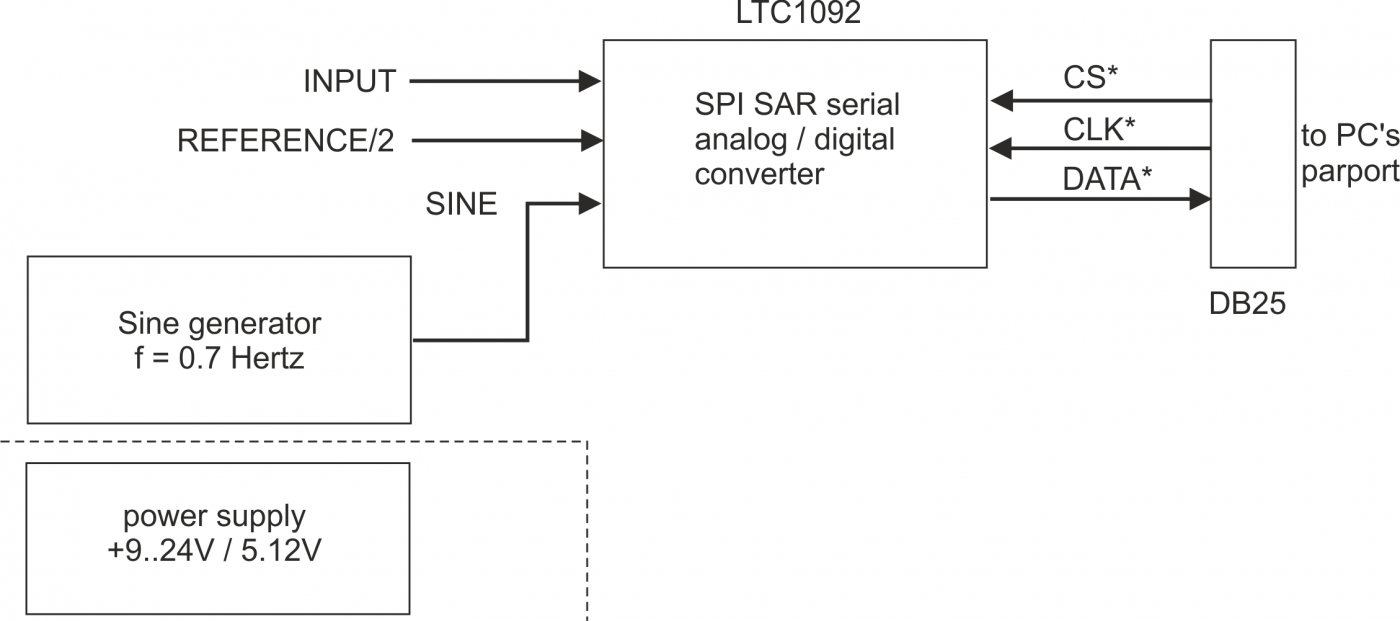 Für einen Laborversuch im 4. Semester Elektrotechnik mit dem Ziel, praktische Erfahrung mit Analog-Digital-Wandlern zu erfahren und die Anwendung einfacher Programmierung in „C“ zu üben, wurde ein einfaches Peripherie-Gerät mit einem A/D-Wandler LTC1092 entworfen, der über ein SPI-Interface oder einfach mit INPUT- und OUTPUT-Befehlen der Leitungen angesteuert werden kann. Dieses wurde über den LPT-Port eines PC angesteuert. Auf der Platine befindet sich weiter ein langsamer Sinusgenerator (~0,7 Hz) als mögliche Signalquelle für Versuche zur Abtastrate und ein Spannungsteiler, der die Mitte des Messbereichs als Spannungswert ausgibt.