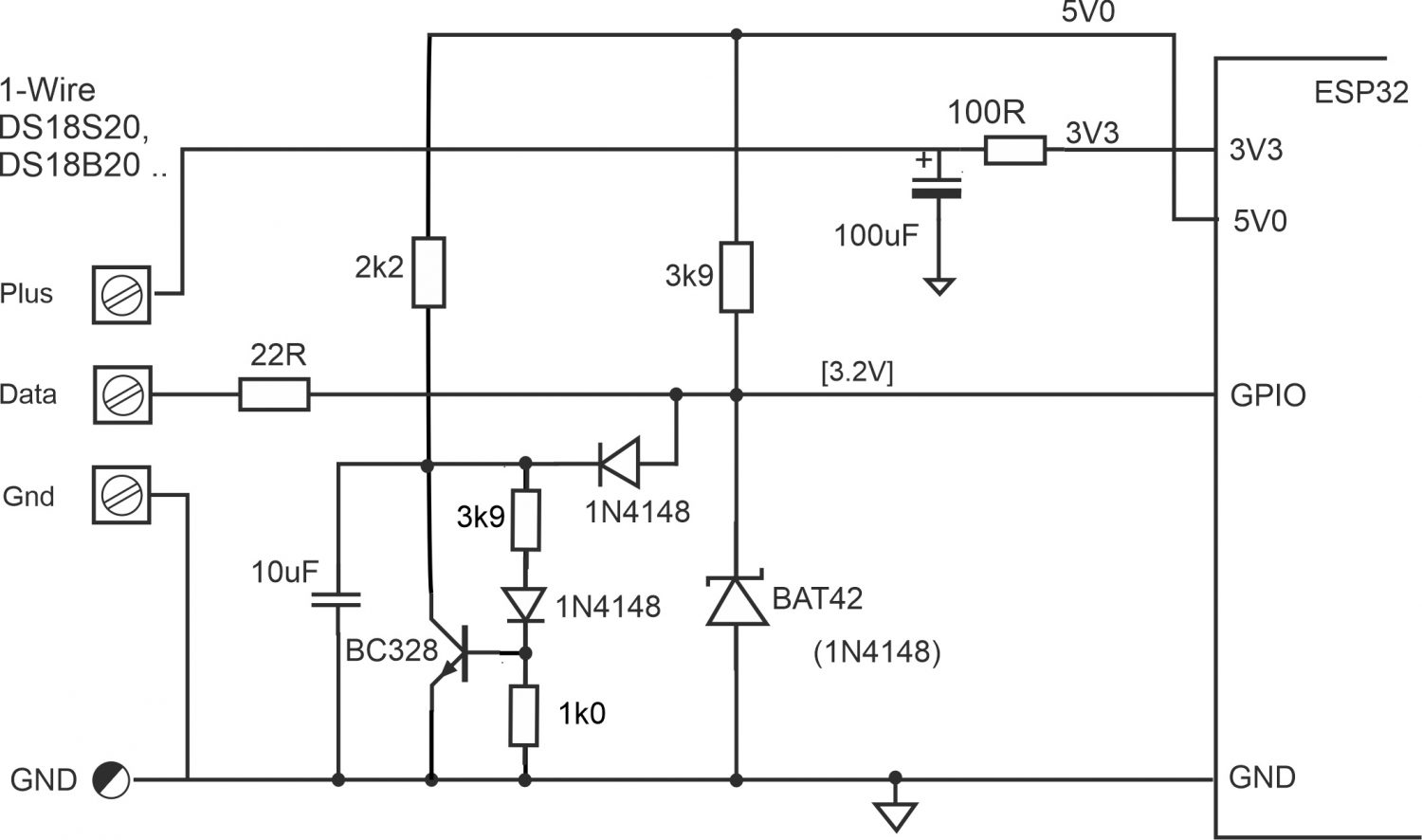 Daher wird hier für die Eingangsstufe zur ESP32-CPU eine Schutzschaltung aufgebaut, die den Pullup-Widerstand 3K9 bereitstellt, aber gleichzeitig die Spannung am GPIO-Pin auf max. 3,2V begrenzt und negative Spannungen verhindert. Störimpulse bis zu mittlerer Intensität und Über-/Unterschwinger des Signals können damit zuverlässig abgeleitet werden.