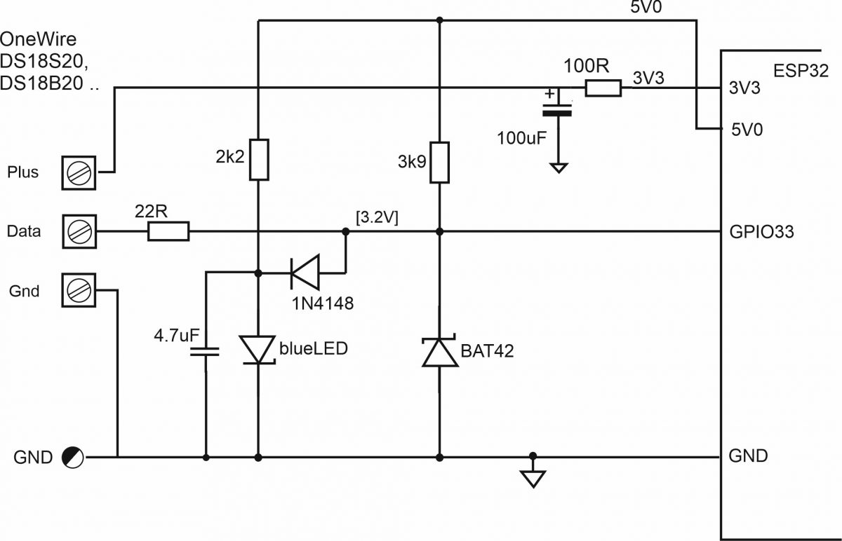 Bei Linux-Systemen ist die Ansteuer-Software im Kernel enthalten, für micropython gibt es mehrere python-Treiber zur Auswahl. Im einfachsten Fall braucht man für die DATA-Leitung des 1-wire-Bus einen 4k7-Widerstand nach 3V3 Versorgungsspannung und einen GPIO-Pin.