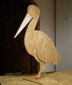 Als Material wurde hier eine OSB3-Platte mit 15 mm verwendet (Reste). Das ist nicht dauer-wetterfest, aber bleibt lackiert ziemlich lange ansehnlich. Setzt man Körper und Flügel aus 3 Stücken zusammen, so ergibt es einen etwas 3D-artigen Anblick mit Schatten und zwischen den Platten einen stabilen Halt für die Aufstellstange. Der spitze Schnabel ist aus normalem Holz, angeleimt und -gedübelt und ergibt später eine bessere Lack-Oberfläche.